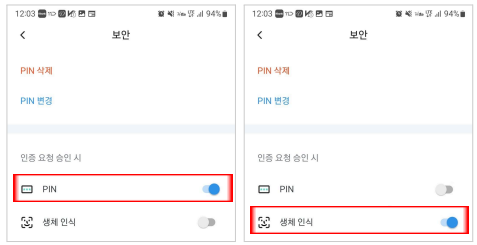 PIN 과 생체 인식 두가지 중 하나만 활성화 할 수 있음