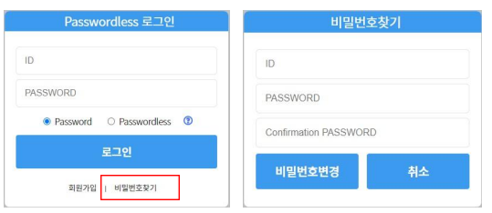 로그인 페이지에 접속한 뒤 “Passwordless” 라디오 버튼을 선택합니다. 하단 “비밀번호찾기”
