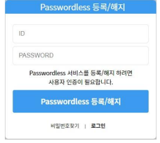 Passwordless X1280 v1 등록 또는 해지를 위해서는 본인확인 과정이 필요합니다. 아이디와 비밀번호를 입력 후 “Passwordless 등록/해지” 버튼을 클릭합니다.